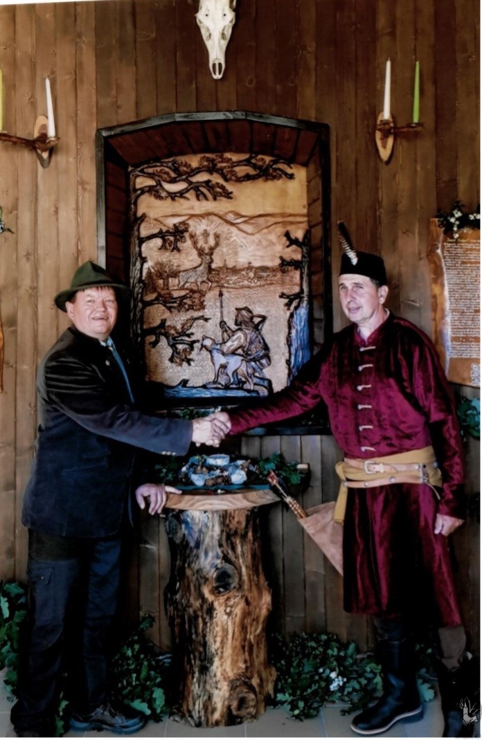 Slávnostné otvorenie poľovníckej kaplnky - rok 2020 - na fotke zľava: miestny rezbár Beňo Štefan - sponzor obrazu a Hojsza Zoltán hlavný organizátor rekonštrukčných prác