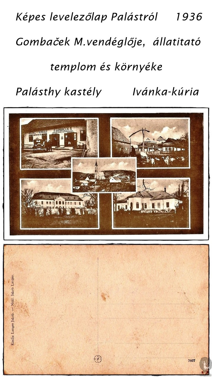 Pohľadnica z r. 1936- krčma Gombačekova, napájadlo, kostol a okolie, Ivánkova kúria